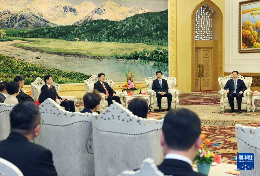 4月27日,中共中央政治局常委、全国政协主席王沪宁在北京会见傅崐萁率领的中国国民党民意代表参访团一行。新华社记者 姚大伟 摄