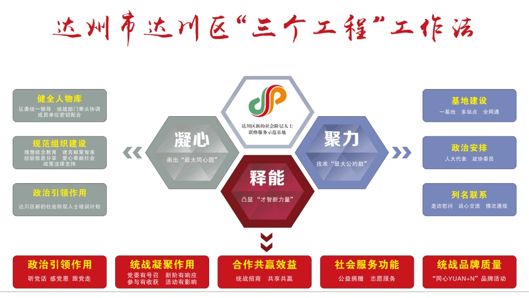 宣汉县商贸物流园主要以电子商务服务中心为阵地,面积约2000平方米,设有统一战线主题教育展厅、同心讲堂、同心书屋、青创空间、创客空间、党外人士之家、新联会活动中心、党员活动室等服务功能,于2017年5月被省委统战部授牌为“四川省新的社会阶层人士统战工作示范基地”。