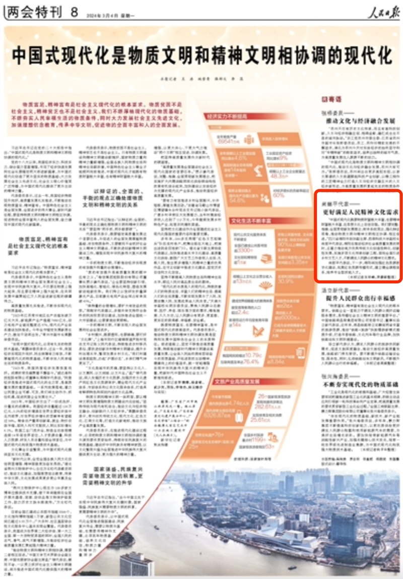 “中国式现代化既要物质财富极大丰富,也要精神财富极大丰富、在思想文化上自信自强。我们要完整、准确、全面贯彻新发展理念,树牢系统观念,强化辩证思维,推动物质文明与精神文明相互协调、相互促进。”四川省绵阳市政协副主席、西南科技大学副校长尚丽平代表说,绵阳在推动经济社会高质量发展的同时,正着力推动地方优秀传统文化创造性转化、创新性发展,实施多项文化传承创新工程,面向全国引进乡村文艺人才,不断满足人民群众的精神文化需求。