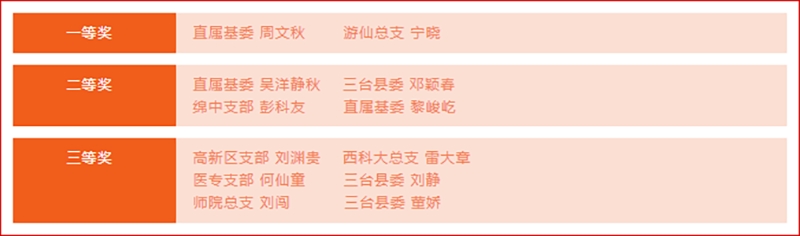 经过激烈角逐,来自民盟三台县委的盟员冯金秀斩获一等奖,直属基委盟员周文秋、涪城基委盟员唐梧侥荣获二等奖,医专支部盟员刘雪梅、游仙总支盟员宁晓、赵斐比分获三等奖。