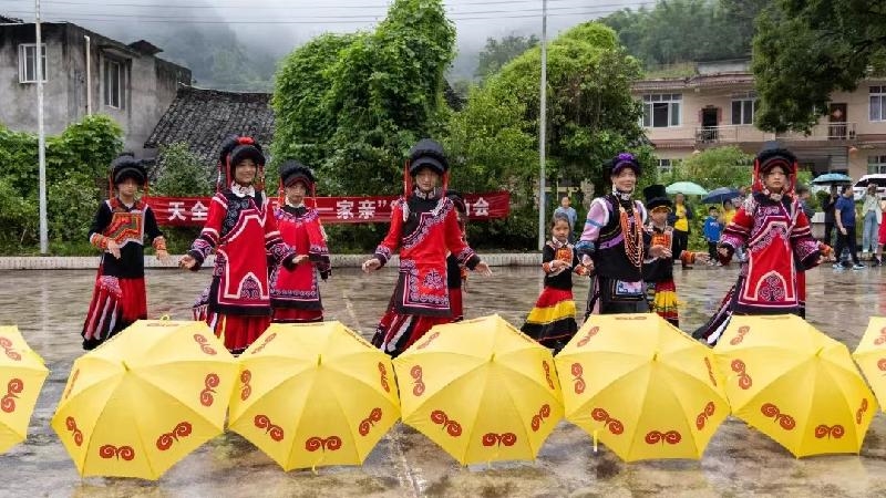 一群手撑黄伞的彝家姑娘们,身着盛装款款而来,一把把黄伞如同一朵朵正在盛放的索玛花,含羞带俏的姑娘们身姿婀娜,愉快的氛围感染了在场的每一位观众。