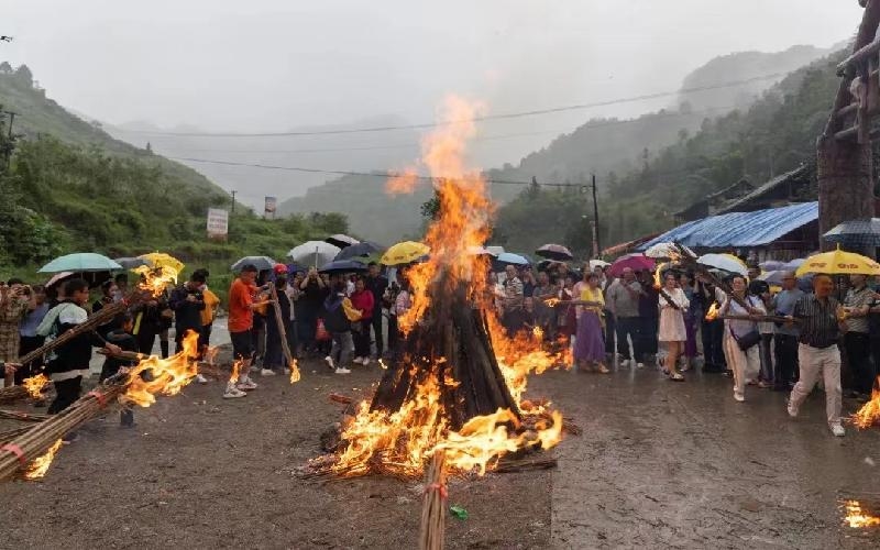 就餐后,篝火晚会及送火仪式开始。淅淅沥沥的雨水浇不灭熊熊燃烧的焰火和大家的热情,各民族同胞们穿着节日的盛装,迈着轻盈曼妙的步伐、在雨中尽情踏歌起舞。