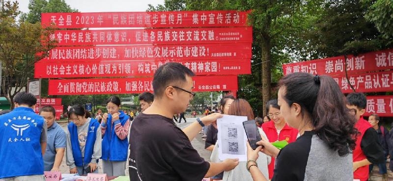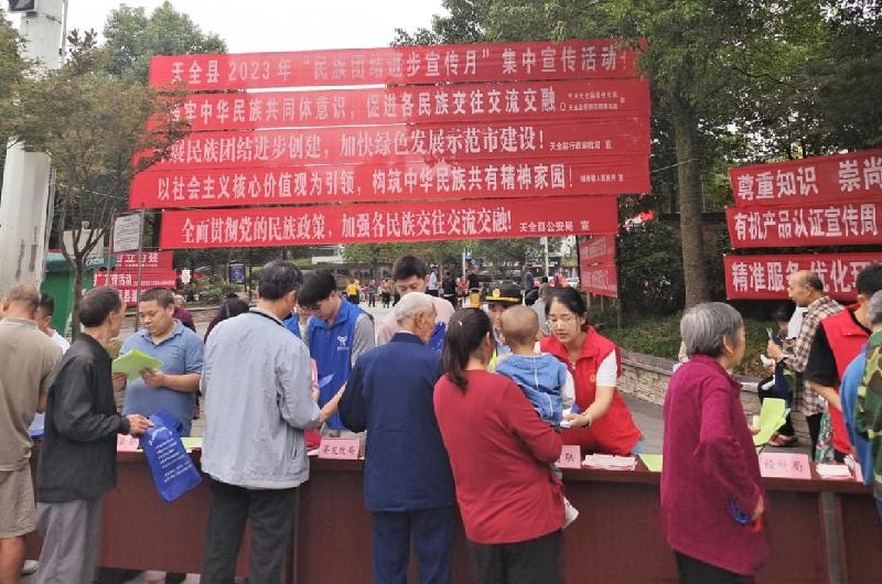 9月19日,天全县委统战部、县民宗局牵头组织县委政法委、县教育局等20余家单位在音乐广场开展2023年“民族团结进步宣传月”集中宣传活动。