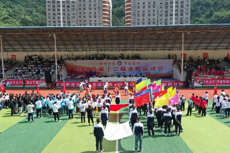 伴随着激昂的音乐,迈着铿锵的步伐,国旗方队、会旗方队、彩旗方队、花环方队、裁判方队以及14支参赛代表队依次走过主席台,充分展示了全县各族干部群众拼搏奋进、昂扬向上的精神风貌。