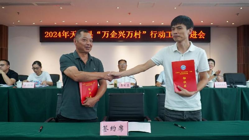 会上,天全县润兆渔业有限公司、天全县恒源农业科技有限公司、雅安农耕时代生态农业有限公司、始阳镇九十村、新华乡落改村负责人作交流发言。在“万企兴万村”行动新增结对村企签约仪式上,天全县恒源农业科技责任有限公司与兴业乡铜厂村、天全县青竹茶业有限公司与乐英乡幸福村、天全县天蜀农业发展有限公司与城厢镇马溪村作为村企结对代表分别进行签约。在“金融民企合作·助力乡村振兴”战略合作签约仪式上,天全县工商联与中国农业银行天全县支行、雅安农商银行天全支行分别签订战略合作协议。