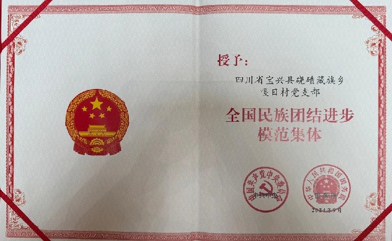 9月27号,2024年全国民族团结进步表彰大会在北京召开,四川省雅安市宝兴县硗碛藏族乡嘎日村党支部被中共中央、国务院授予“全国民族团结进步模范集体”称号。