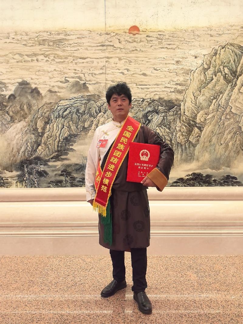 ▲嘎日村党支部书记、村委会主任阿生在北京领奖