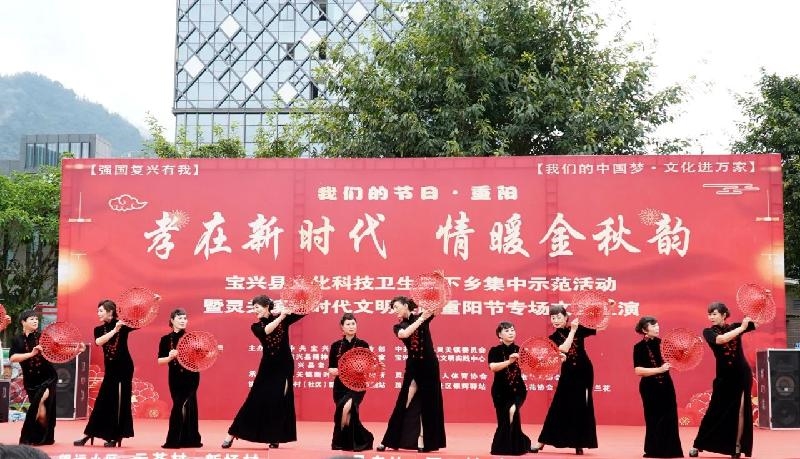 爱在金秋,情暖重阳。10月11日,以“孝在新时代 情暖金秋韵”为主题的宝兴县文化科技卫生三下乡集中示范活动暨灵关镇新时代文明实践重阳节专场文艺汇演活动在灵关镇新时代广场举行,旨在进一步弘扬中华优秀传统美德,营造尊老、敬老、爱老、助老的良好社会氛围。