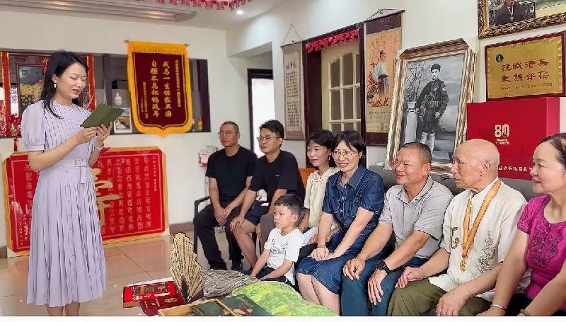 “敬爱的老兵:见字如唔。爷爷,您穿越了一个世纪,见证了百年沧桑。今年是抗战胜利八十周年,这份致敬虽迟,却承载着我们最深的敬仰。如今的国泰民安,正是您和无数先辈青春热血浇灌出的最美续章……”活动现场,市直商贸支部主委周敏代表慰问组,以饱含深情的语调分别为百岁抗战老兵喻志永和曾德祥朗诵了慰问信。一字一句饱含感恩,一声一语满含敬意,让在场众人仿佛重回那段烽火连天的峥嵘岁月,深刻体会到老一辈革命者为民族独立所付出的巨大牺牲,感恩他们的无悔付出才有今天的和平盛世。