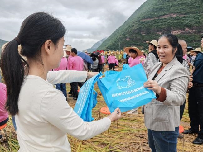 活动上,“米面时装周”T台秀、“打谷子”比赛、“浑水摸鱼”“趣味捉鸡”“力拔山河”拔河比赛等丰富多彩的活动生动展现了农村生活的多彩与创意,让各族群众共庆丰收、共叙团结。现场悬挂了民族团结进步宣传横幅,发放了民族团结进步应知应会宣传单、帆布包、围裙等宣传资料500余份,通过民族团结进步知识宣讲,引导广大群众增强文化认同,坚定文化自信,不断铸牢中华民族共同体意识。