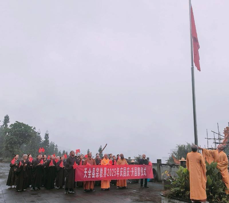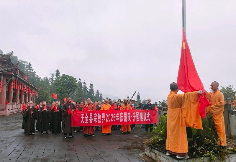 为庆祝中华人民共和国成立76周年,持续深化宗教界爱国主义教育,进一步激发宗教界人士和信教群众的爱国热情,9月28日,天全县民宗局组织宗教界在慈朗寺举行庆国庆·升国旗仪式。慈朗寺、红灵山寺负责人、宗教教职人员(常住人员)、信教群众等30余人参加活动。