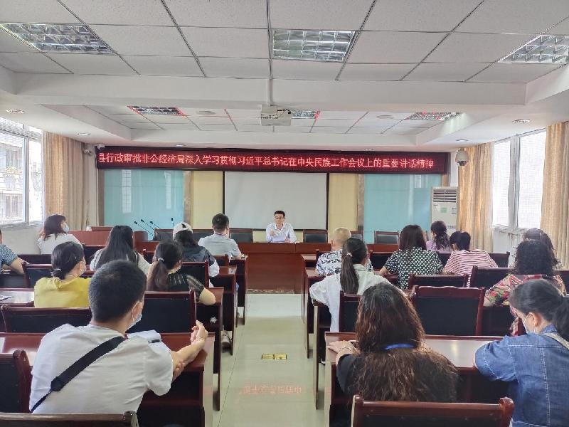2022年5月10日上午,筠连县行政审批和非公经济发展局组织召开“民族团结进步示范县”创建应知应会知识宣讲会,局机关和中心窗口全体干部职工参加宣讲会。