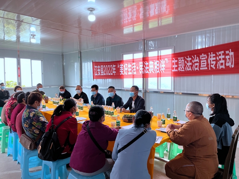 今年五月是第二个“民法典宣传月”。为深入学习贯彻习近平法治思想,真正让民法典走到宗教教职人员和信教群众身边,近日,江安县民宗局、江安县司法局到金仙洞寺开展2022年“美好生活·民法典相伴”主题宣传活动暨“法律进宗教活动场所”法治宣传活动。金仙洞寺民主管理组织全体成员及部分信众20余人参加本次活动。
