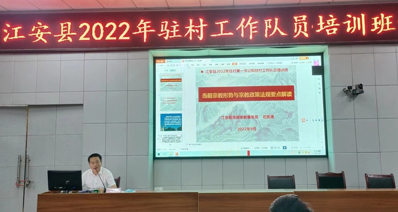 9月2日,江安县结合2022年驻村第一书记和驻村工作队员培训班,举办了宗教政策法规知识专题培训,特邀请江安县委统战部副部长、县民宗局局长石安德为150余名驻村第一书记和驻村工作队员讲授了一堂《当前宗教形势与宗教政策法规要点解读》的专题课程。这是江安县进一步贯彻落实中央和省、市、县委关于加强和改进党对宗教工作的领导、切实做好宗教工作的一项重要举措。