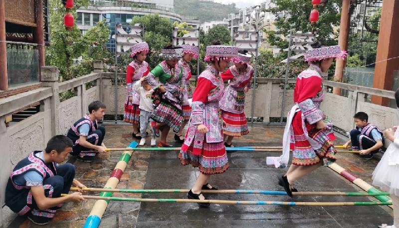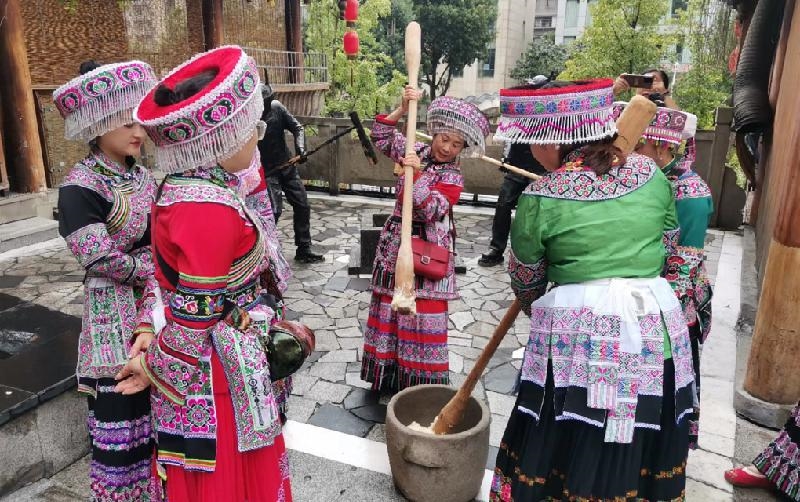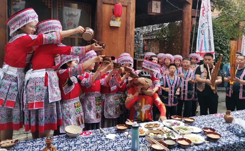 本次苗族非遗传承体验活动分为拦路酒、竹竿舞、打糍粑及苗家长桌宴。在苗寨街道上,苗族群众在苗寨入口处列队迎宾,载歌载舞,悠扬的芦笙乐曲和翩翩的舞姿让人赏心悦目,拦路酒让远方的贵宾感受到苗族群众的热情。打糍粑是一辈又一辈人传承下来的民俗记忆,更是一件热闹的事情,你一杵我一杵,糍粑软糯可口,浓浓的情谊在欢声笑语里凝聚。年轻的苗族小伙和苗族姑娘随着音乐的节奏跳起竹竿舞,富有节奏的舞步轻盈地在竹竿的变化中欢快跳跃,为群众带来一场视觉与听觉的文化“盛宴”。在苗家长桌宴体验活动上,百张桌子连成“一”字,摆上苗族九大碗菜肴和香甜的米酒,苗族长老隆重宣布长桌宴开席,大家有序入座品尝苗家美食,长老亲自切月饼,表达对中秋佳节的祝愿。席间,美丽的“咪猜”唱着动听的敬酒歌,以苗家最高礼遇“高山流水”敬献嘉宾,体现苗家儿女的热情好客,也寓意将美好的祝福送给远方的客人。