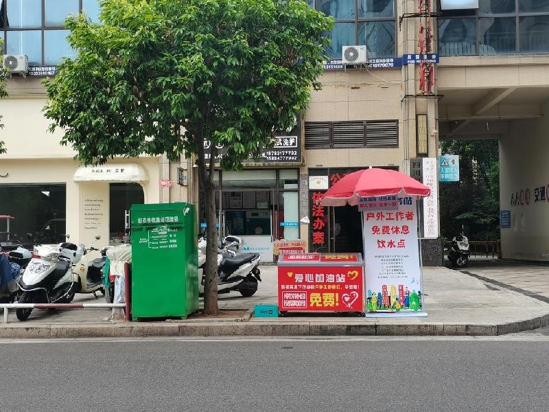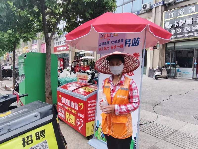 清凉驿站里一台张贴“爱心冰箱,免费自取”字样标识的冰箱格外醒目,冰箱里整齐地摆放着冰镇矿泉水,设置了遮阳棚供户外工作者们歇脚乘凉,此外还配备了藿香正气水、十滴水、清凉油等应急防暑药品可按需取用。活动现场,陆续有穿梭于街巷间的快递小哥或是顶着烈日清扫街道的环卫工人来取走冷饮,感受清凉。环卫阿姨表示:“天气炎热,来上一瓶冰镇饮料,在这里休息一下,感觉舒服多了!”