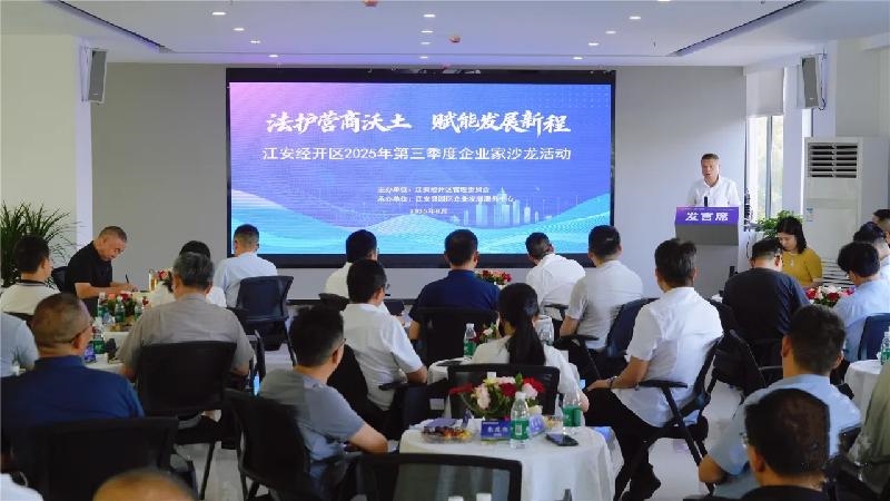 近日,江安县2025年第三季度企业家沙龙活动举行。本次活动以“法护营商沃土,赋能发展新程”为主题,旨在通过政策解读与面对面交流,进一步优化营商环境,助力企业稳健发展。江安县委书记张林,江安县委副书记、江安经开区党工委书记杨宇出席活动。