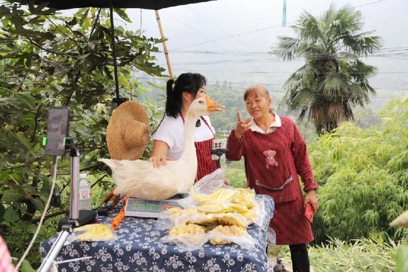 当地村民对这场直播活动纷纷表示认可。村民郑定红高兴地说:“能把我们山里的土货卖到全国各地,让大家都尝尝,我觉得很有意思”。这次直播带货的产品全部来自满山红村村民自家的农产品,包括乌骨鸡、鹅、鸭、方竹笋等,这些过去大多只能在本地集市销售的农产品,如今通过一根网线直面全国市场。据悉,在本次“兴文乌骨鸡&兴文方竹笋”仙峰山直播活动中,直播间售出方竹鲜笋420斤,线下预定量约3吨,乌骨鸡等家禽的销量也超过110只。