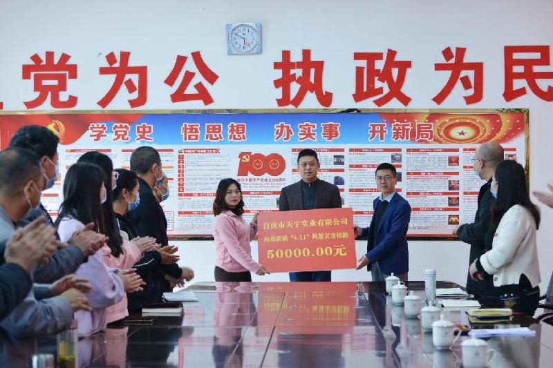 4月11日,荣县鼎新镇遭遇了50年不遇的风暴灾害,造成镇内农业、农房、道路受损。作为无党派人士、市县人大代表、荣县工商联副主席、自贡天宇公司董事长的刘永洪得知信息后,立即与鼎新镇党委政府联系,于4月18日将5万元捐款送到鼎新镇。当日,荣县工商联会员企业自贡金龙水泥有限公司也联系鼎新镇并捐出100吨水泥,帮助受灾群众抗灾自救。