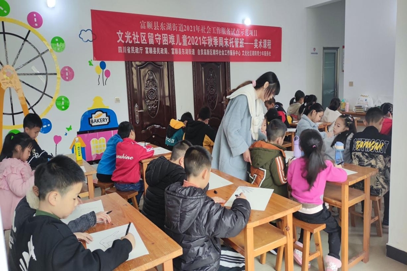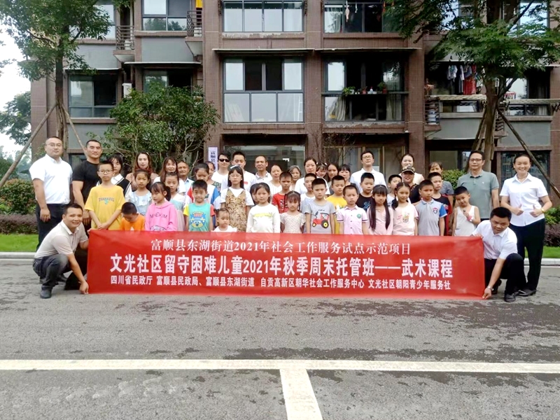 全县首创“微课堂”,打造“一站式”青少年综合服务平台。东湖街道文光社区充分整合社会各级优质资源,为社区儿童尤其是社区困境儿童和留守儿童提供免费的文体课程、成长咨询、公益活动等综合服务,有效填补青少年成长过程中课外素质教育的空白。社区内的富顺县启智幼儿园园长、富顺县新的社会阶层人士联谊会副会长周孝梅,作为统战代表人士在关爱儿童成长中起到了重要作用,她发动在校教师利用课后、节假日为留守儿童提供优质服务,她还邀请富顺县龙腾武悦武术培训学校校长、富顺县新的社会阶层人士联谊会会员钱兴东教孩子们练习武术、强身健体。