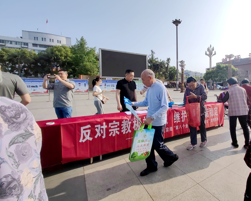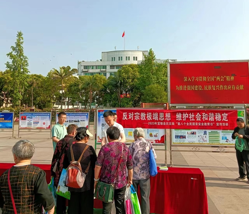 4月15日,富顺县委统战部、民宗局、保密局、国安办、公安局、司法局等部门在釜江广场联合开展以“反对宗教极端思想 维护社会和谐稳定”为主题的宣传教育活动。