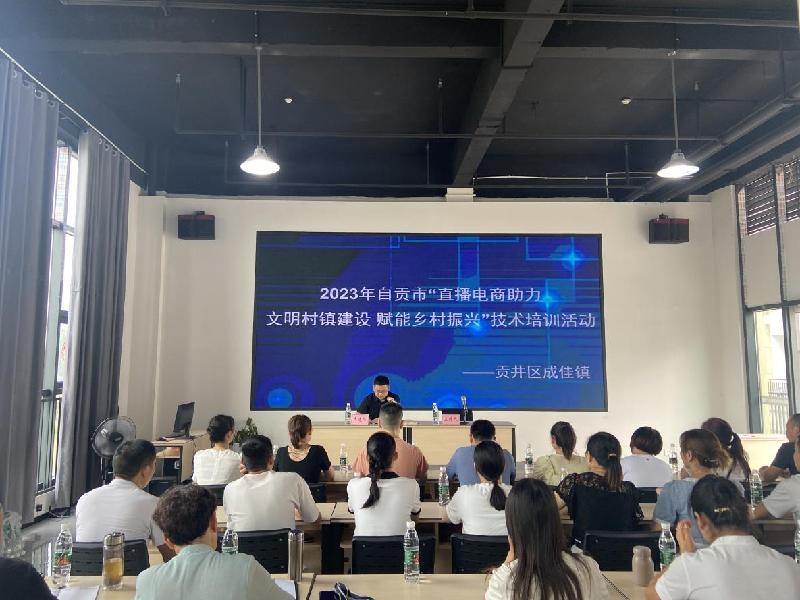 近日,由贡井区委统战部、区商务局、区妇联和成佳镇联合主办的“直播电商赋能乡村振兴”(成佳镇专场)培训班在自贡市5G电商直播孵化产业园举办。成佳镇的村(社区)两委干部及网络直播达人等40余人参加培训,邀请贡井区贡建培训学校讲师授课。
