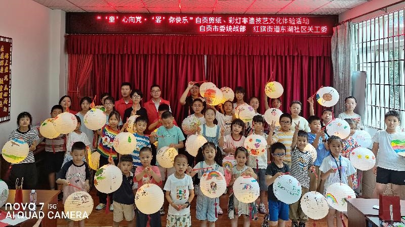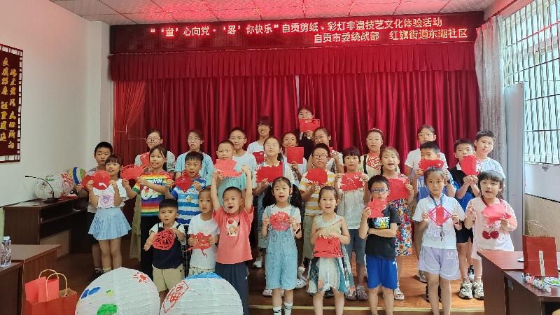 7月12日,中共自贡市委统战部与高新区红旗街道东湖社区联合开展以“‘童’心向党·‘暑’你快乐”为主题的自贡剪纸、彩灯非遗技艺文化体验活动,丰富挂包社区青少年儿童的暑期文化生活,让孩子们体验非遗技艺文化魅力,激发对党、对祖国、对家乡的热爱。40余名来自汉族、彝族等各民族青少年儿童参加活动。