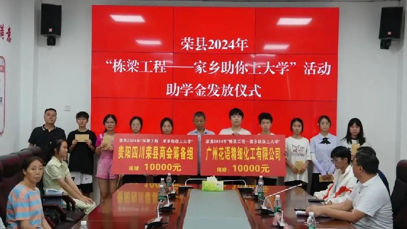 8月27日,荣县2024年“栋梁工程——家乡助你上大学”活动助学金发放仪式举行。仪式现场,四川衡立泰投资管理咨询公司、西藏四川荣县商会、广州花语精细化工有限公司、贵阳四川荣县商会筹备组集中向36名学生发放助学金7.4万元,以鼓励这些即将走进大学校园的学生砥砺奋进。