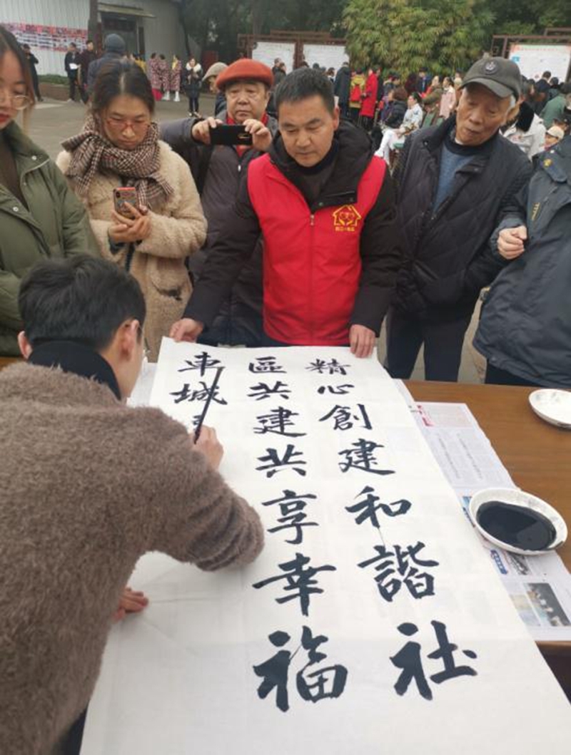 四川省新联会书画院院长杨志立等七位书画家和资阳市十余名艺术家现场为群众送春联、送福字、送剪纸,开展茶艺展示、集邮展示等,把最美好的新春祝福送到社区群众手中,让社区群众感受到浓浓的年味。