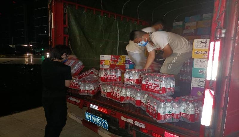 8月29日晚10时,在乐至城区金世纪购物商场外,工作人员正冒雨将获捐的口罩、方便面、矿泉水等物资搬运到抗疫物资运输车上。