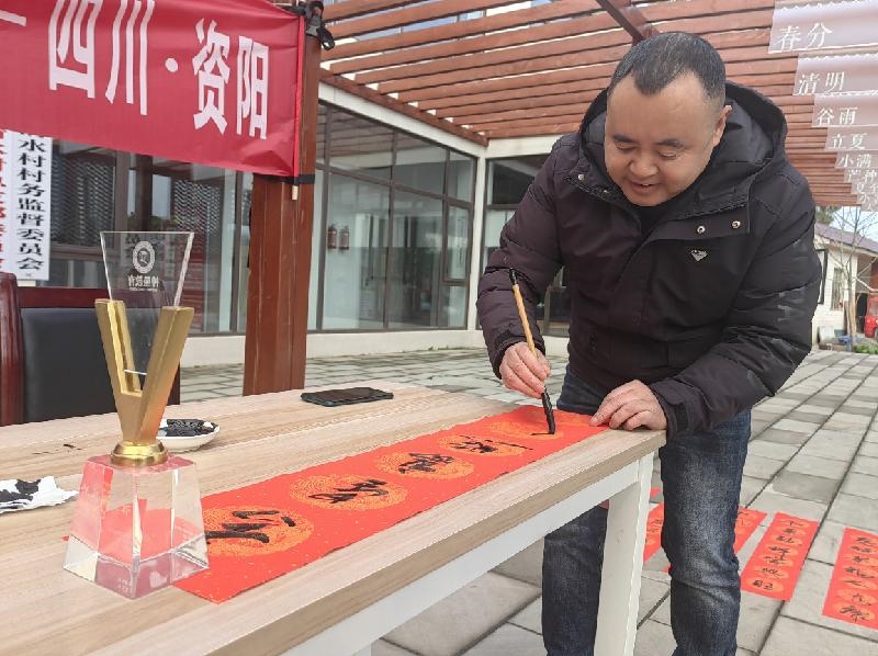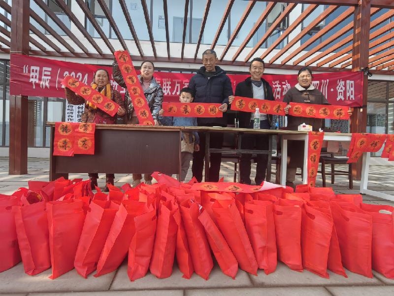 “民安国泰逢盛世,风调雨顺颂华年”“一帆风顺年年好,万事如意步步高”“金龙贺岁千祥至,彩凤迎春百福来”“春归大地人间暖,福降神州喜临门”……活动现场,随着资阳民进会员及志愿者的现场疾书,一幅幅饱蘸浓墨、字迹俊秀的春联新鲜出炉,让村民沉浸在新年到来的喜庆氛围中,感受着中华优秀传统文化的独特魅力。