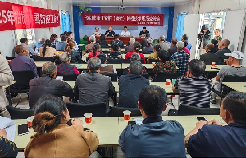 近日,资阳市雁江区2025年雁媛生产管理技术培训会在南津镇雁江蜜柑产销联盟驻地举行。雁江区委统战部组织全区100余名雁媛种植户、果技员齐聚一堂,通过“理论授课+实地观摩”的形式,系统学习雁媛种植管理新技术,为提升柑橘品质、推动产业升级注入新动能。